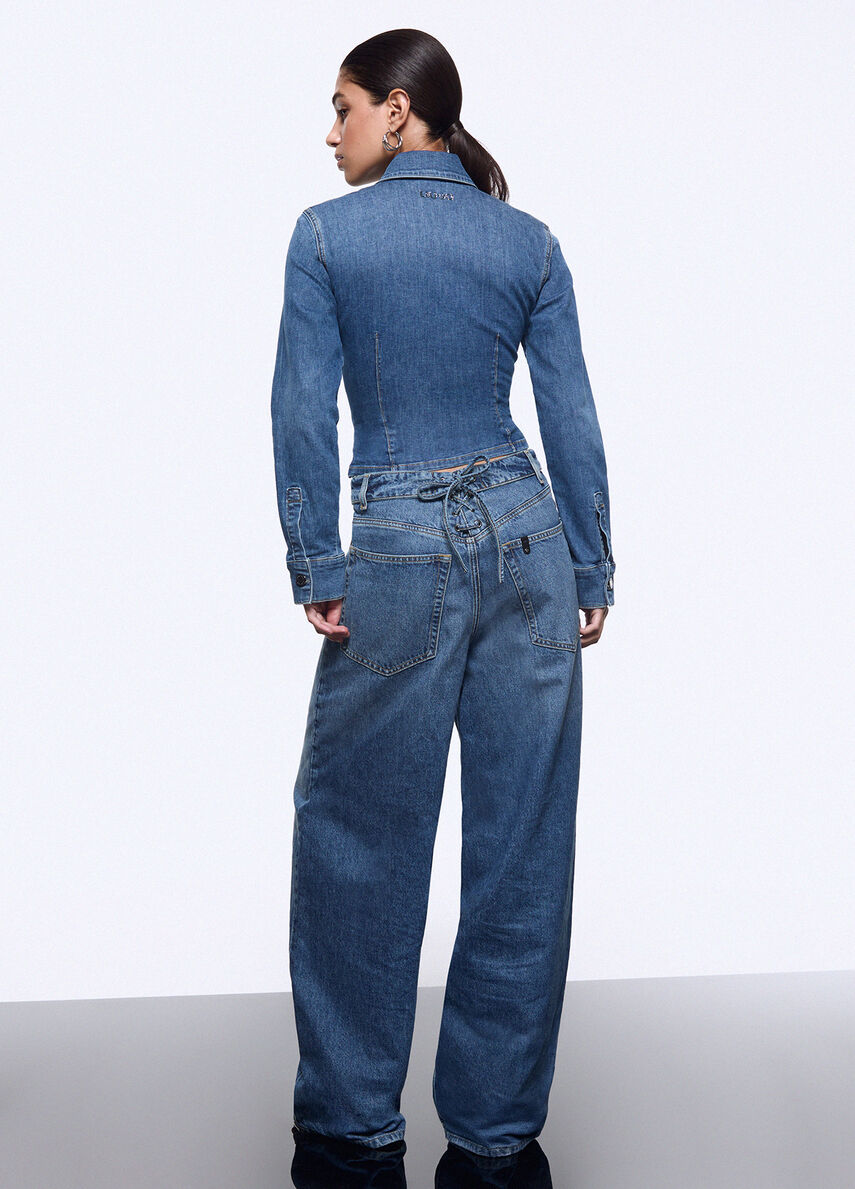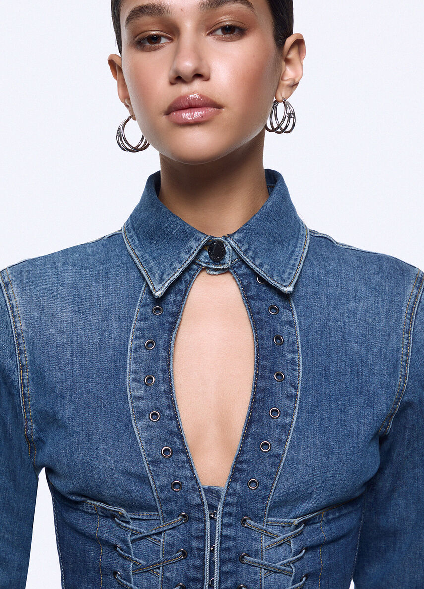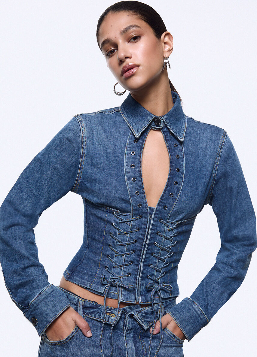 Camicia in denim stretch Lavaggio stonewash leggero Slim fit Colletto camicia Bottone a pressione logato Cut-out sul davanti Maniche lunghe Stringhe decorative Chiusura nascosta